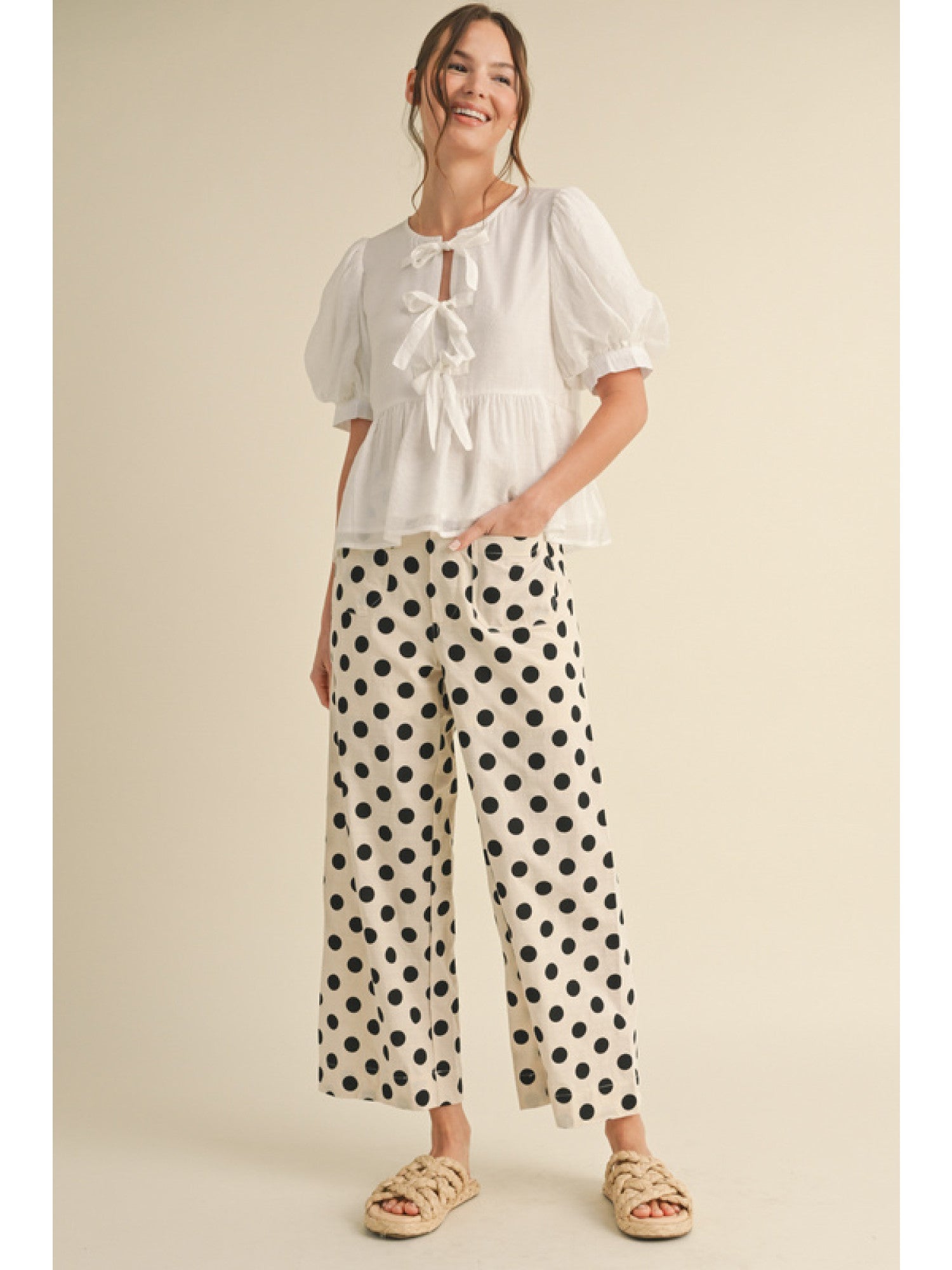 These black and ivory polka dot wide-leg pants feature a hidden zipper closure and a back stretch band for a comfortable, tailored fit. Crafted from lightweight, non-sheer fabric, they offer breathability without sacrificing coverage. Practical side and back pockets blend seamlessly into the design, combining style with functionality. Ideal for a polished yet relaxed look, these pants suit taller frames perfectly, as modeled by a 5'10" individual wearing a size Small.