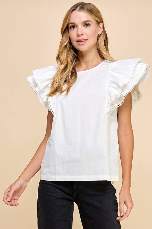 Round neckline top with ruffle sleeves and contrast color trim. Featuring a back buttoned keyhole.