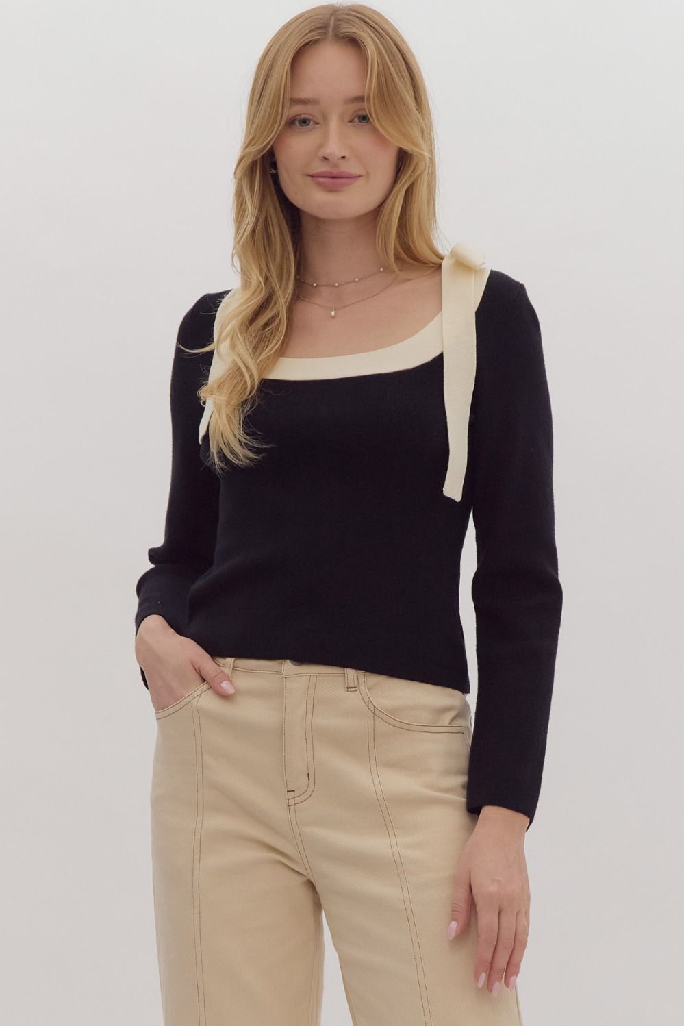 This sweater knit top boasts a solid rounded square neckline, along with a fixed ribbon detail at the shoulder. It is unlined and constructed from a non-sheer, midweight knit material.