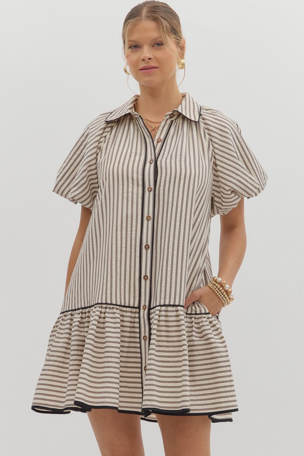 This mini dress features a sophisticated stripe pattern with short bubble sleeves and a ruffle hem, adding a playful yet refined touch. Designed with a contrast accent binded collar and button-front closure, it offers subtle inset details for enhanced structure. Practical side pockets and a fully lined, lightweight woven fabric blend of 60% cotton and 40% polyester ensure comfort and durability. Ideal for those seeking a stylish, non-sheer dress that balances elegance with everyday wearability. The model is 5'10" and wears a size Small.