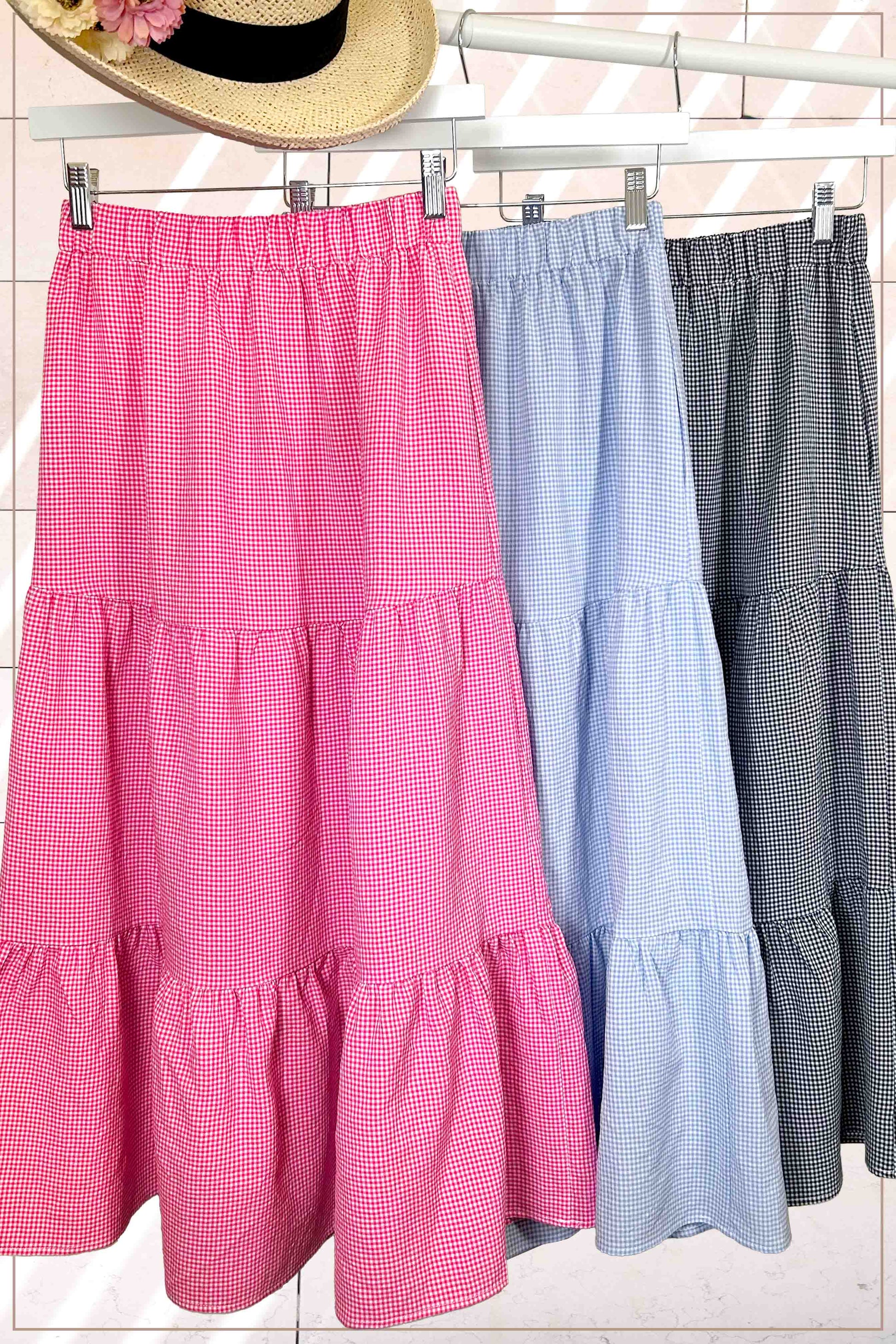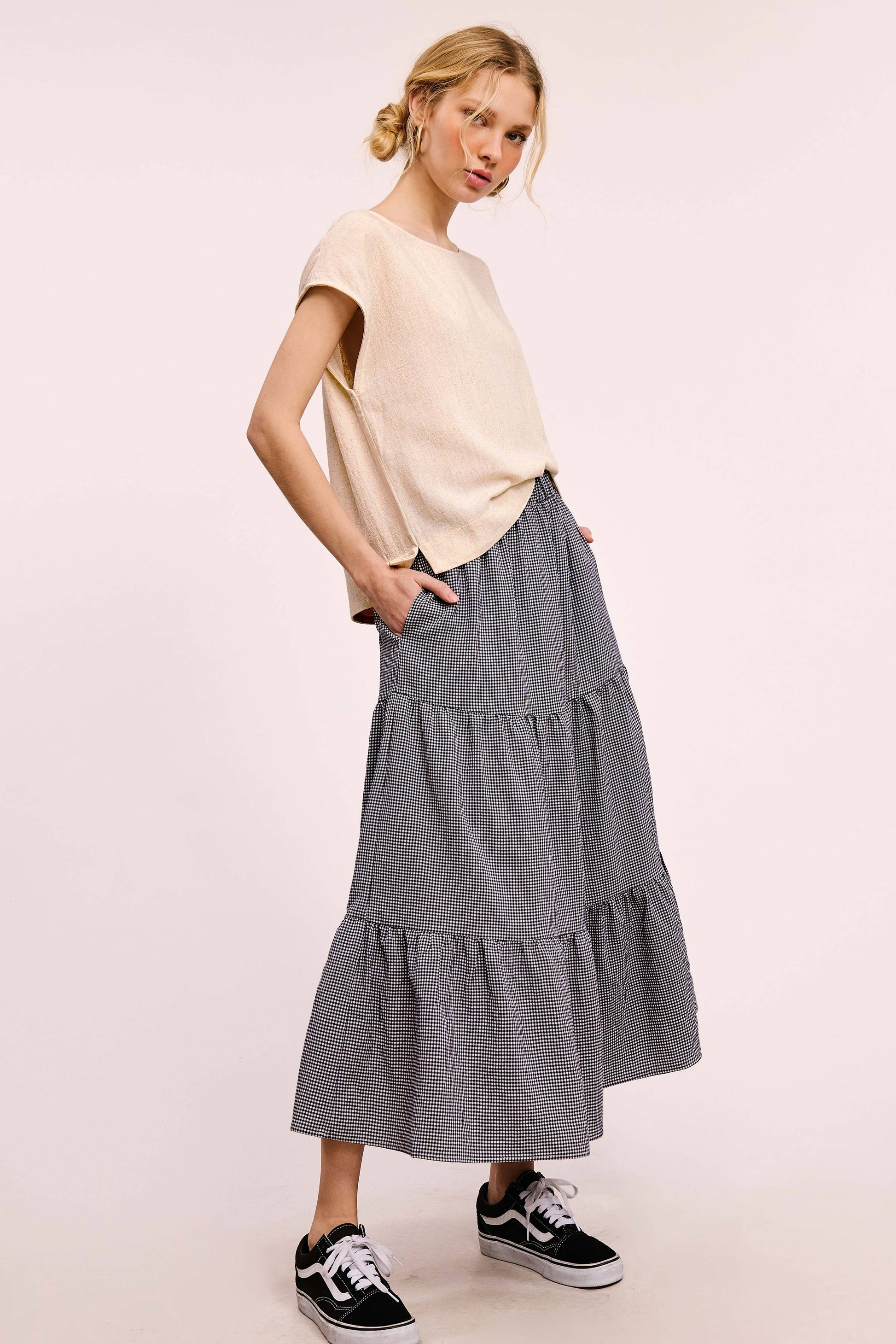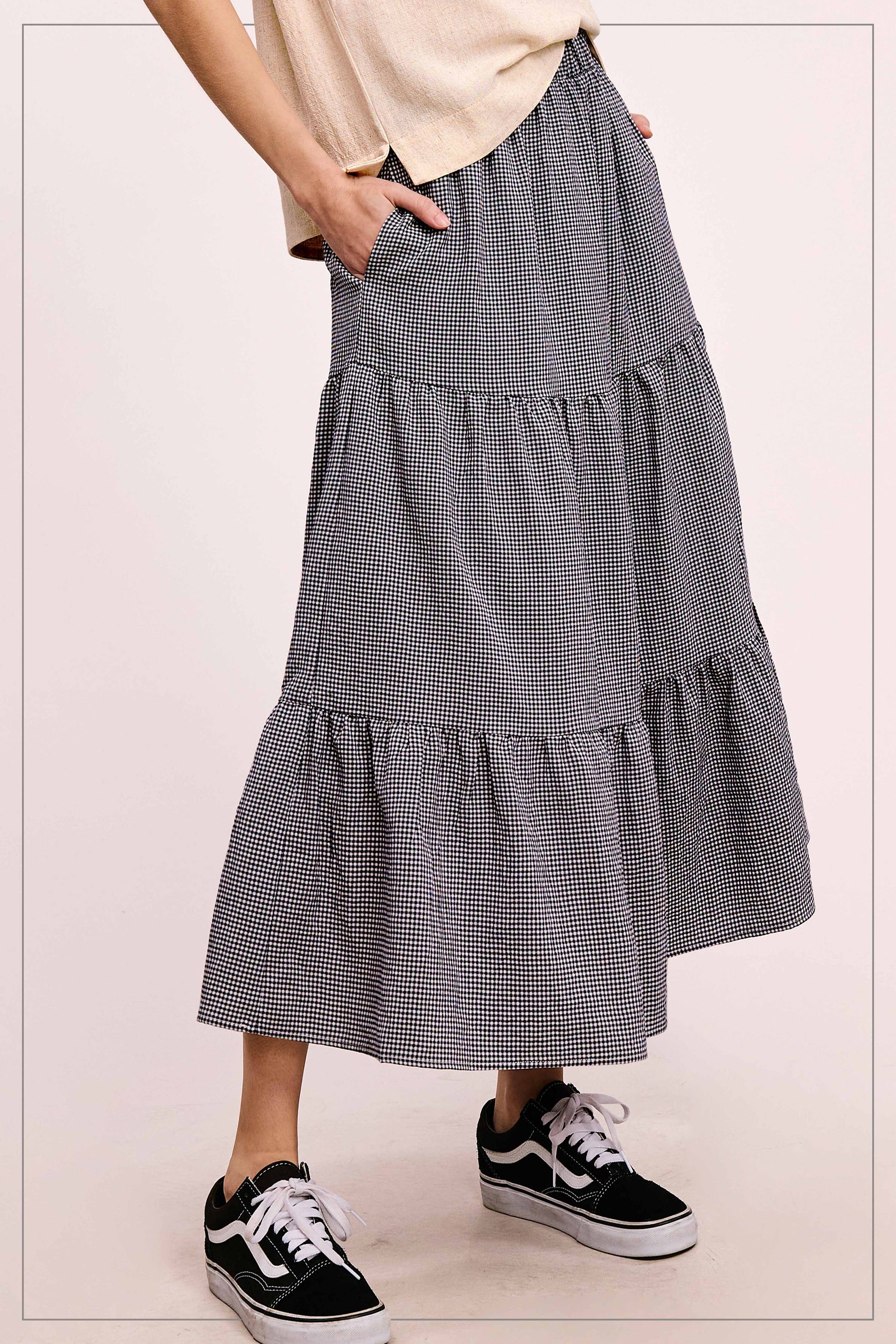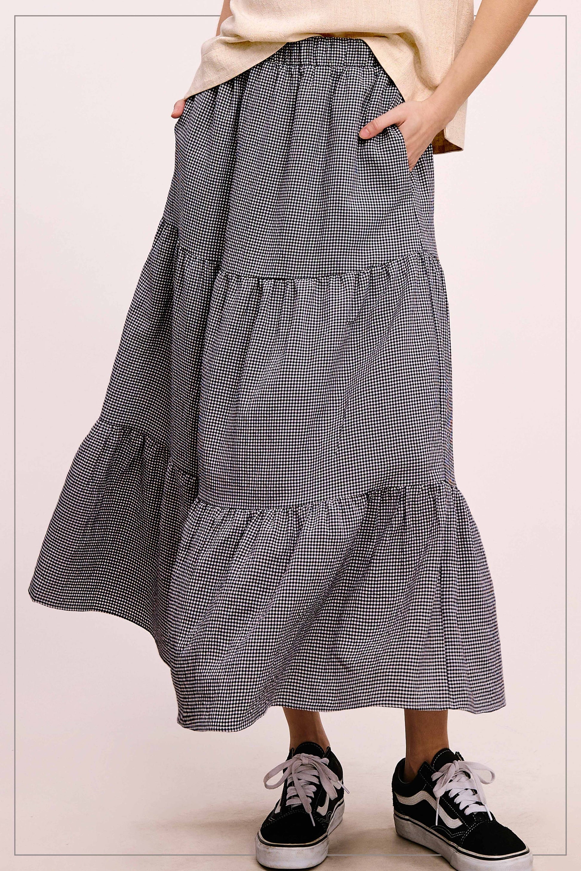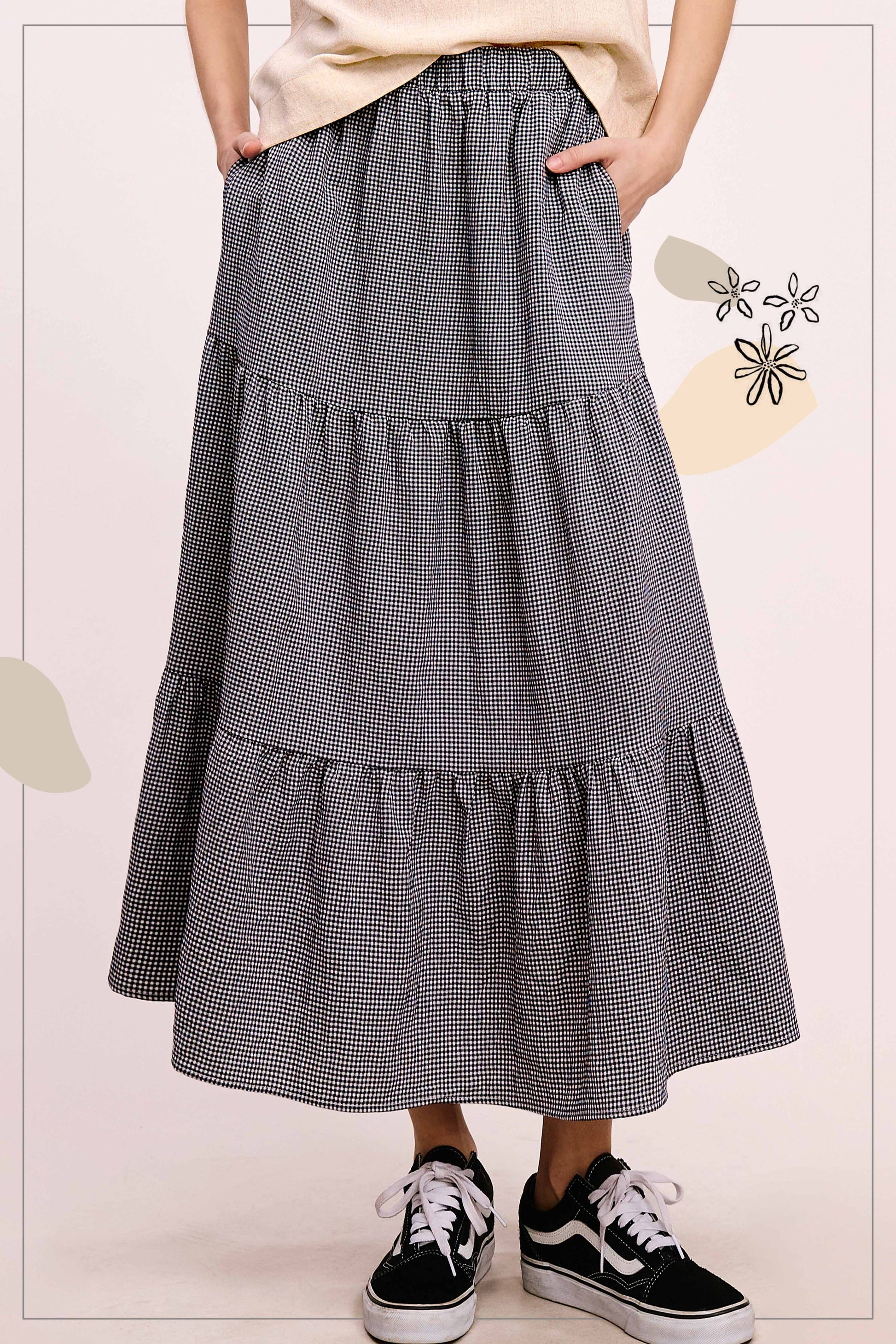 gingham pattern skirt, tiered skirt, maxi length skirt, elastic waistband, side pockets, relaxed fit, feminine look, lightweight fabric