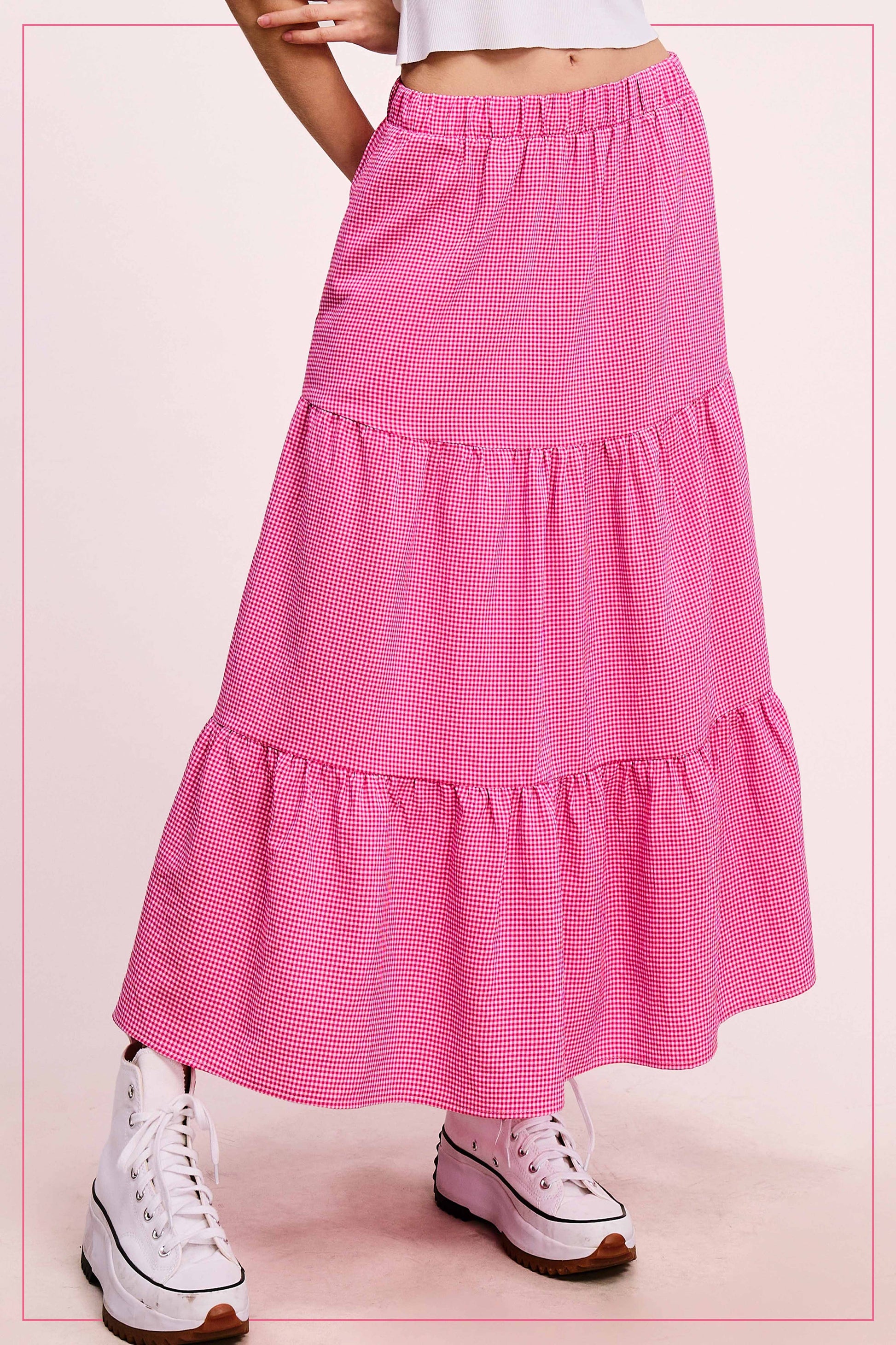 Gingham tiered maxi skirt with a comfortable elastic waistband and side pockets. The skirt features a relaxed fit with multiple gathered tiers, adding volume and movement. The lightweight fabric and classic gingham pattern give it a casual yet feminine look, perfect for pairing with a crop top and sneakers for a stylish, effortless outfit.