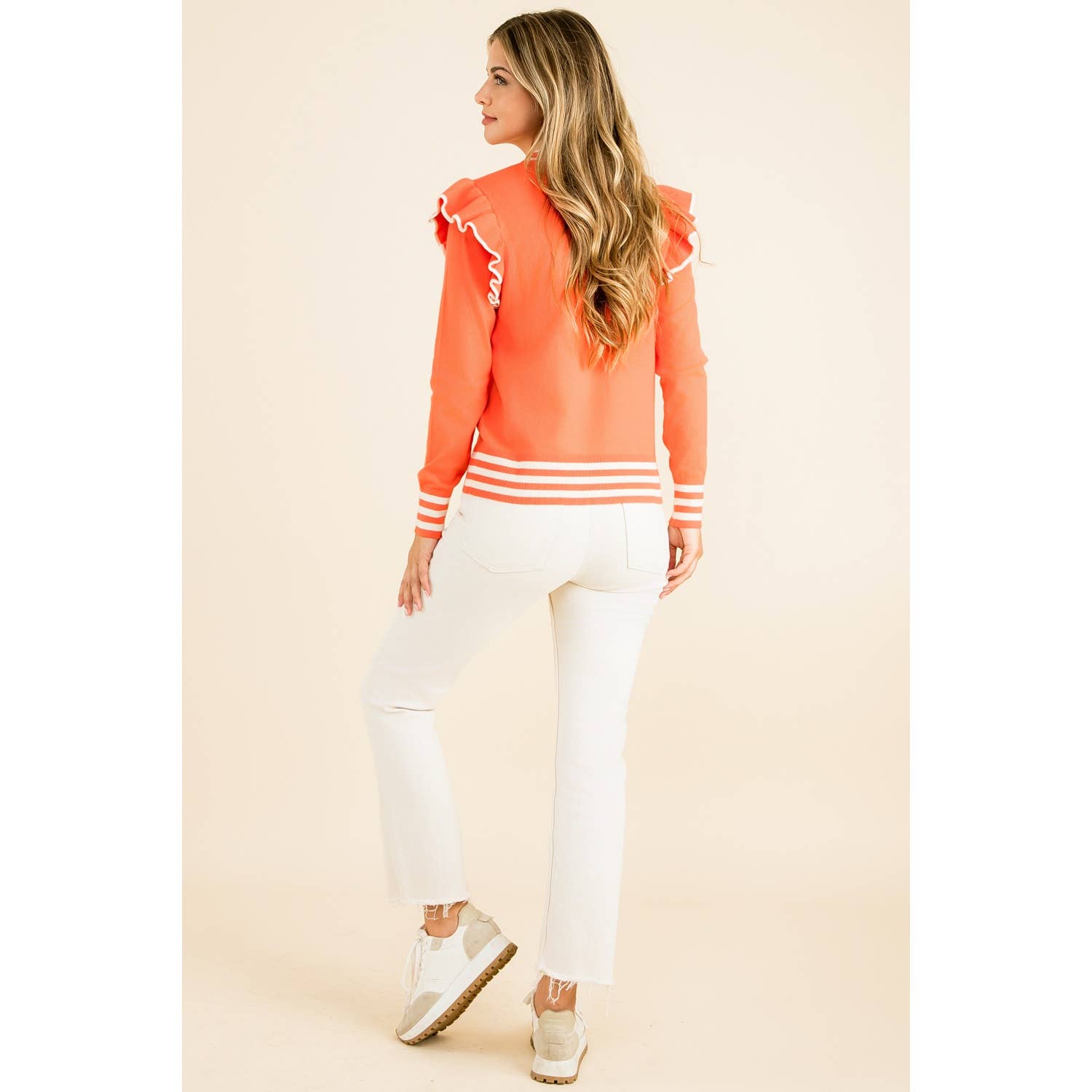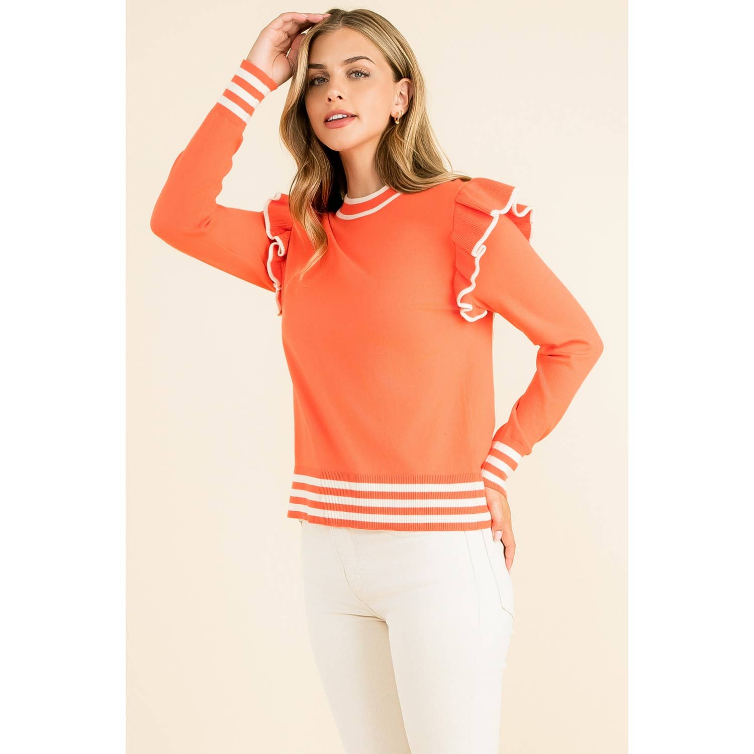 Orange Ruffle Shoulder Long Sleeve Sweater with Stripes