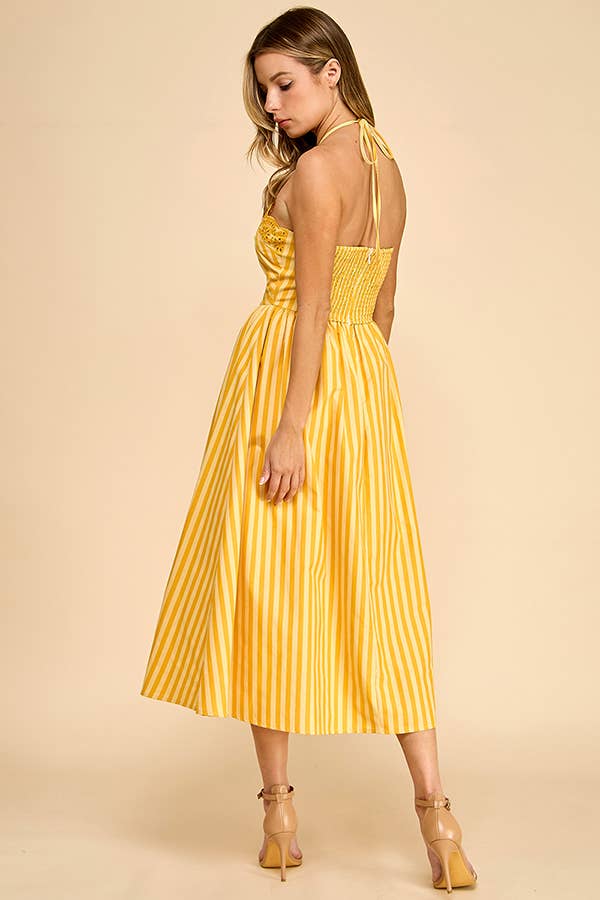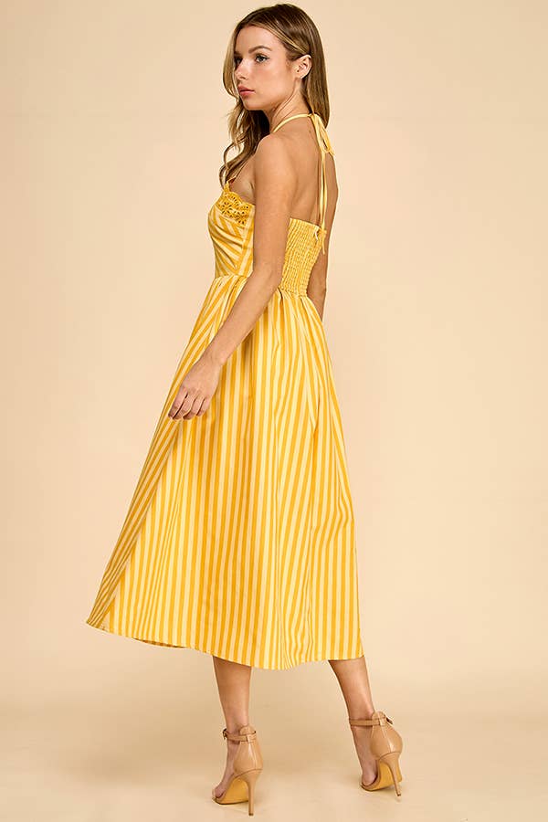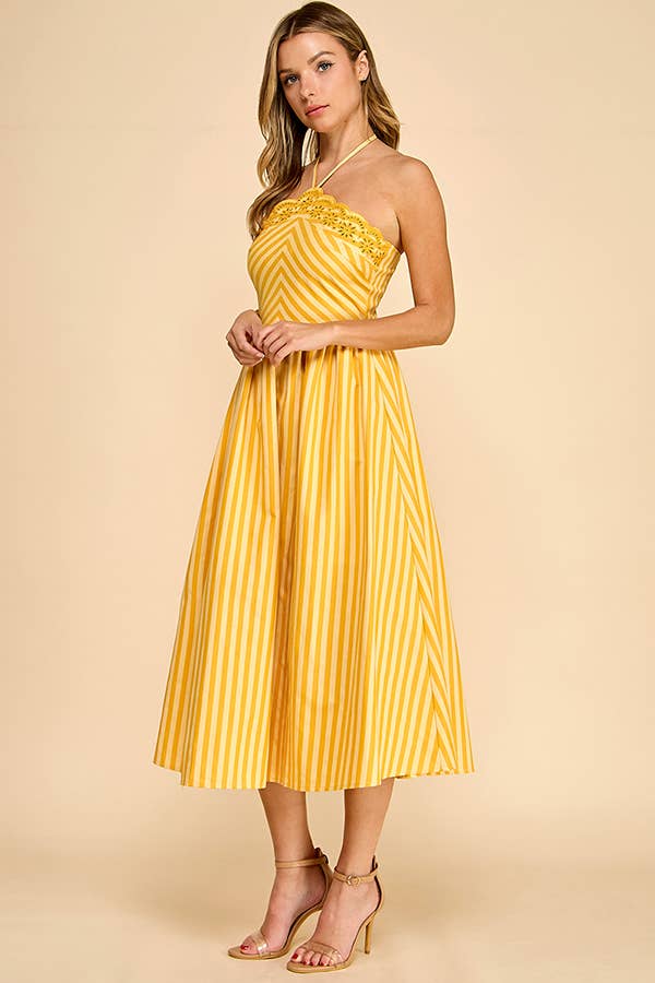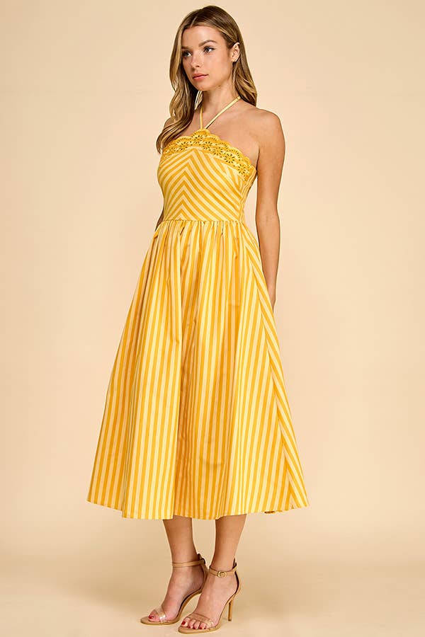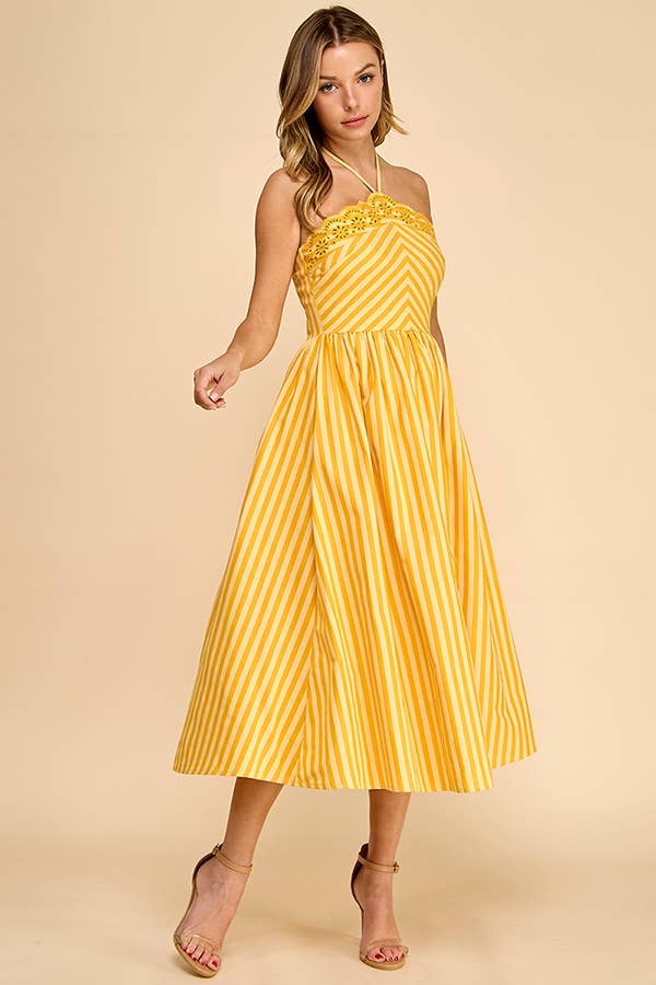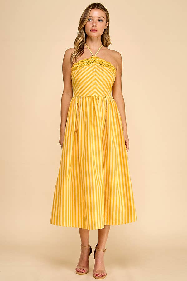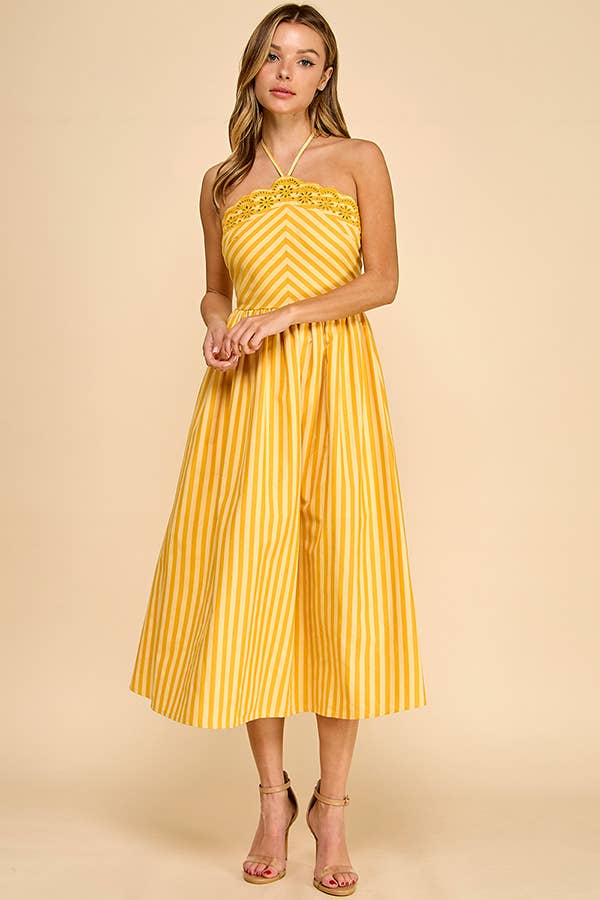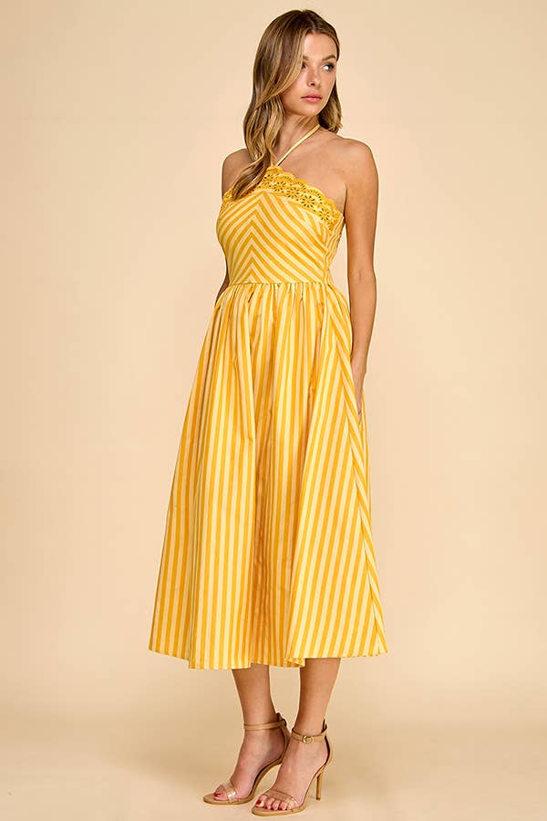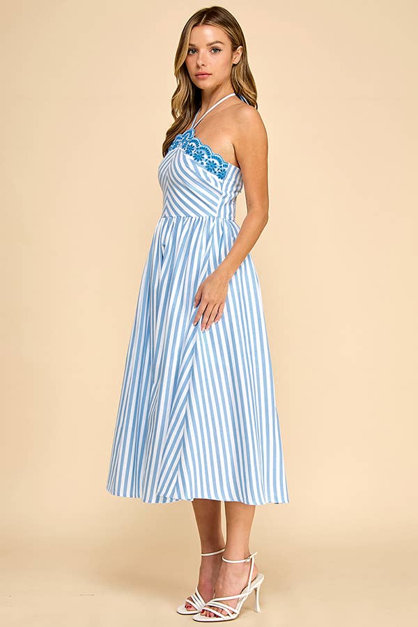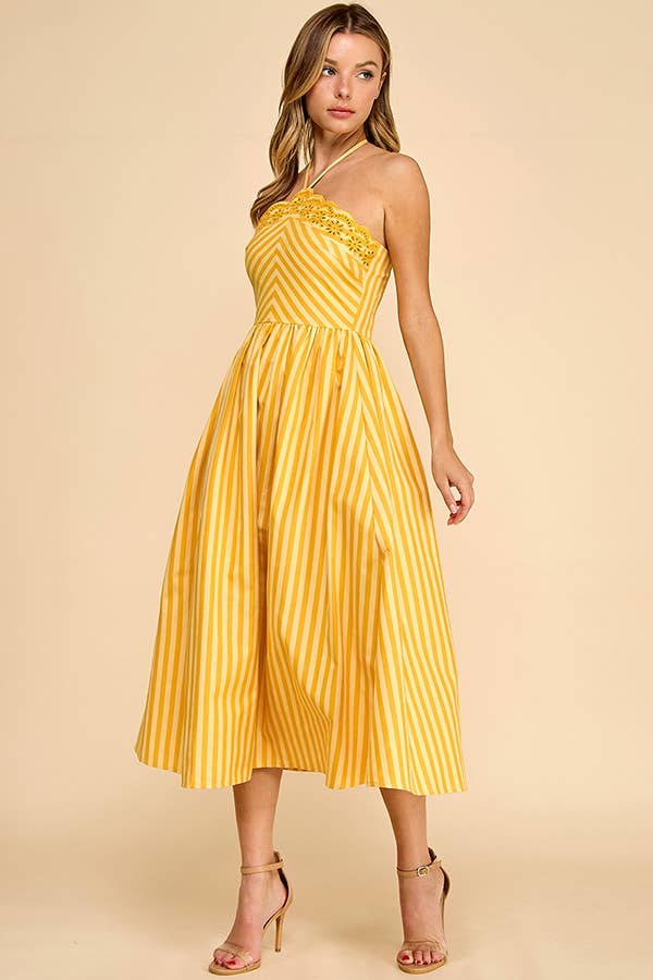Effortlessly elegant, this halter midi dress features delicate scalloped detailing that adds a touch of feminine charm. The flattering halter neckline provides support and style, while the midi length offers a sophisticated silhouette perfect for brunch, garden parties, or special occasions. Soft pink and white tones create a fresh, romantic look that transitions beautifully from day to evening. A wardrobe essential for anyone seeking timeless, polished style.