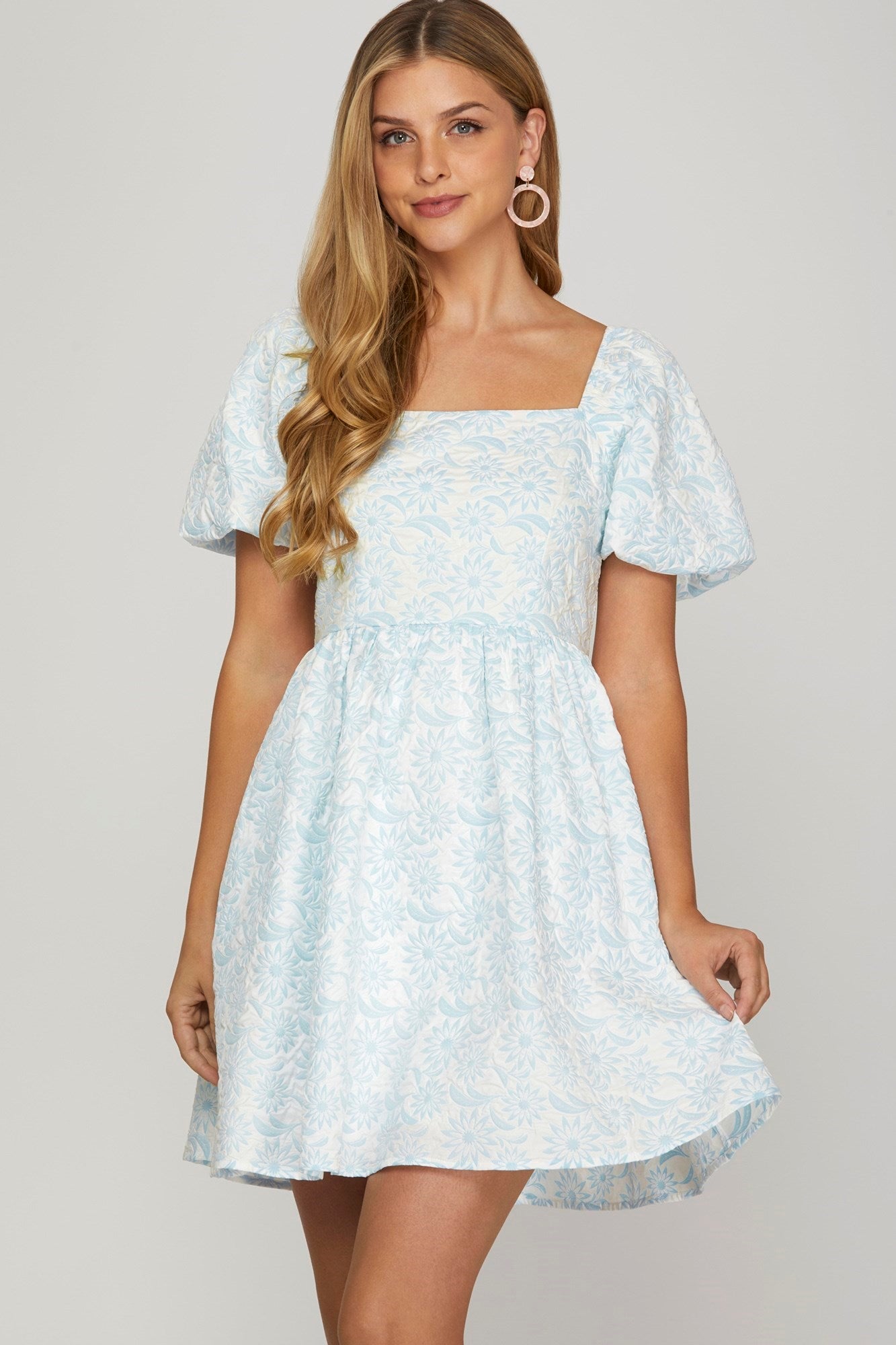 PUFF SLEEVE BABY DOLL JACQUARD DRESS WITH SIDE POCKETS