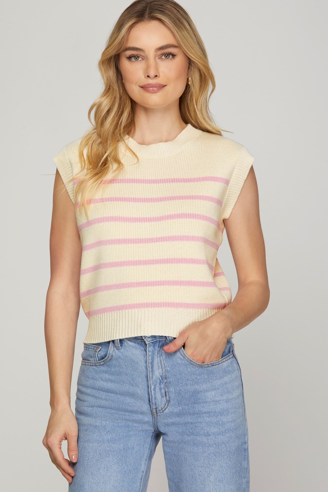 Expertly crafted for a chic yet casual look, this She + Sky pink and cream stripped top is the perfect addition to your wardrobe. Made with high-quality materials, its sleeveless design and unique color combination offer a stylish and comfortable fit. Elevate any outfit with this versatile top.